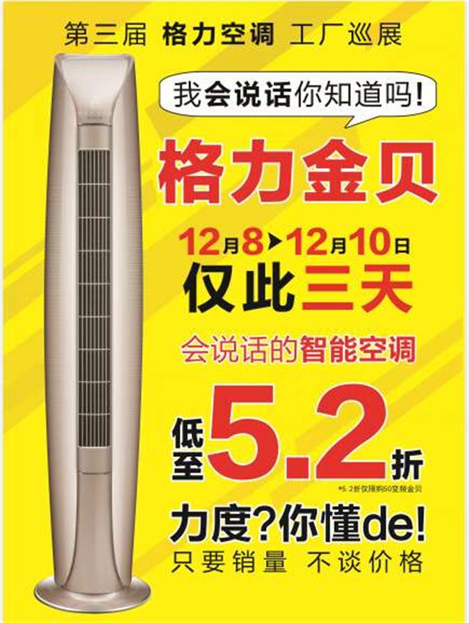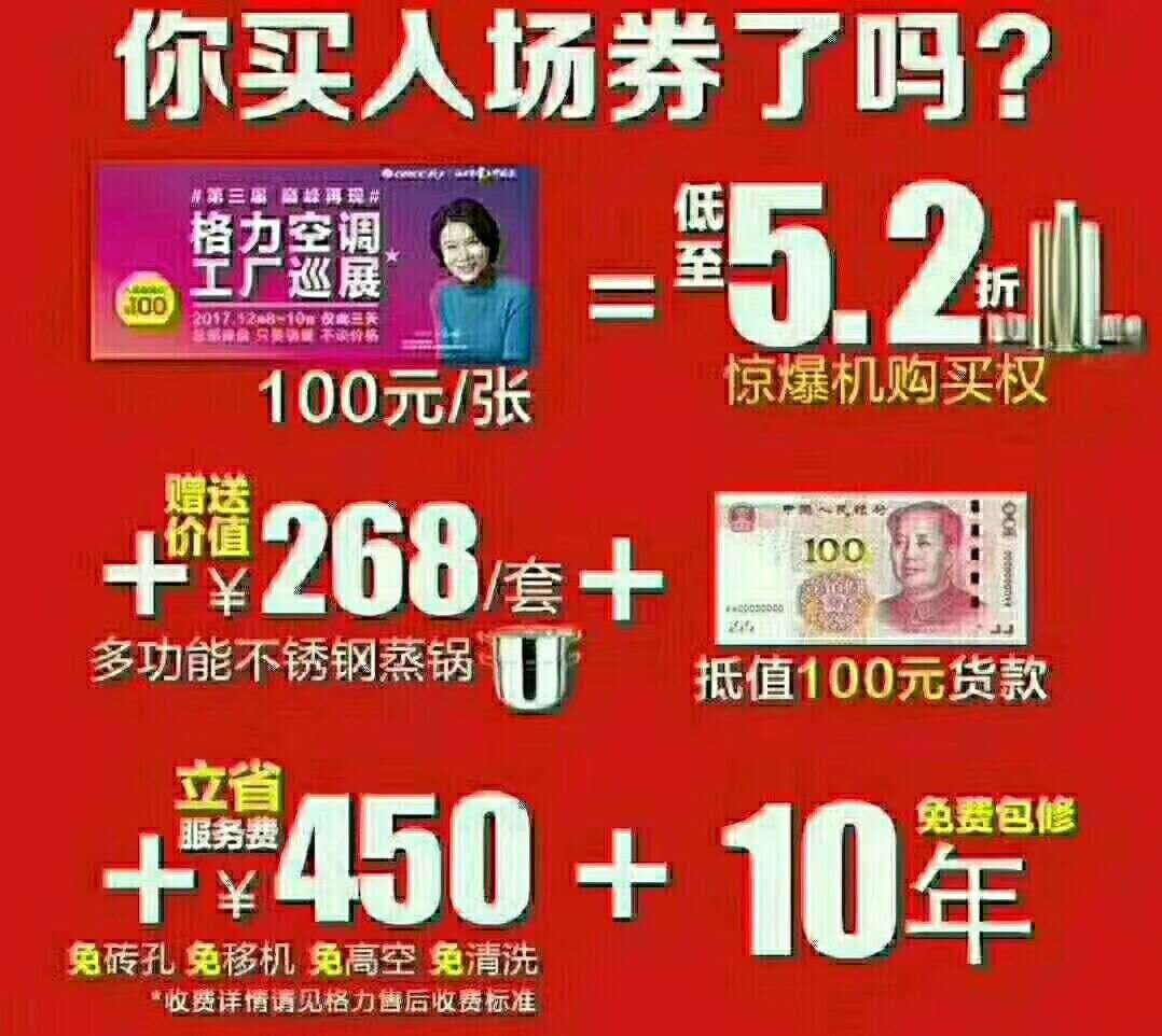 華商空調(diào)又有大動(dòng)作了!!格力空調(diào)2017年度工廠巡展,董總操盤(pán)只要銷量,不談價(jià)格。僅此一次,價(jià)格低到超乎你想象!即日起全面接受認(rèn)籌,當(dāng)天憑入場(chǎng)券可以免費(fèi)領(lǐng)取268元白鋼蒸鍋一個(gè)!享受10年保修,四項(xiàng)免費(fèi)!超低的價(jià)格,超快的安裝,超值的服務(wù),還有一款“會(huì)說(shuō)話”的空調(diào)等你們來(lái)參觀哦!想買空調(diào)的你們還在等什么?快來(lái)?yè)屬?gòu)入場(chǎng)券吧!